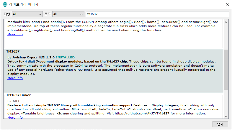 라이브러리 매니저를 키고 TM1637 을 선택해서 설치해주자.