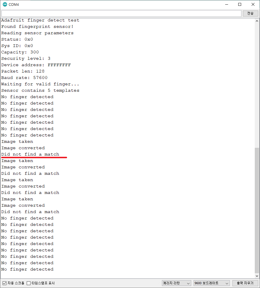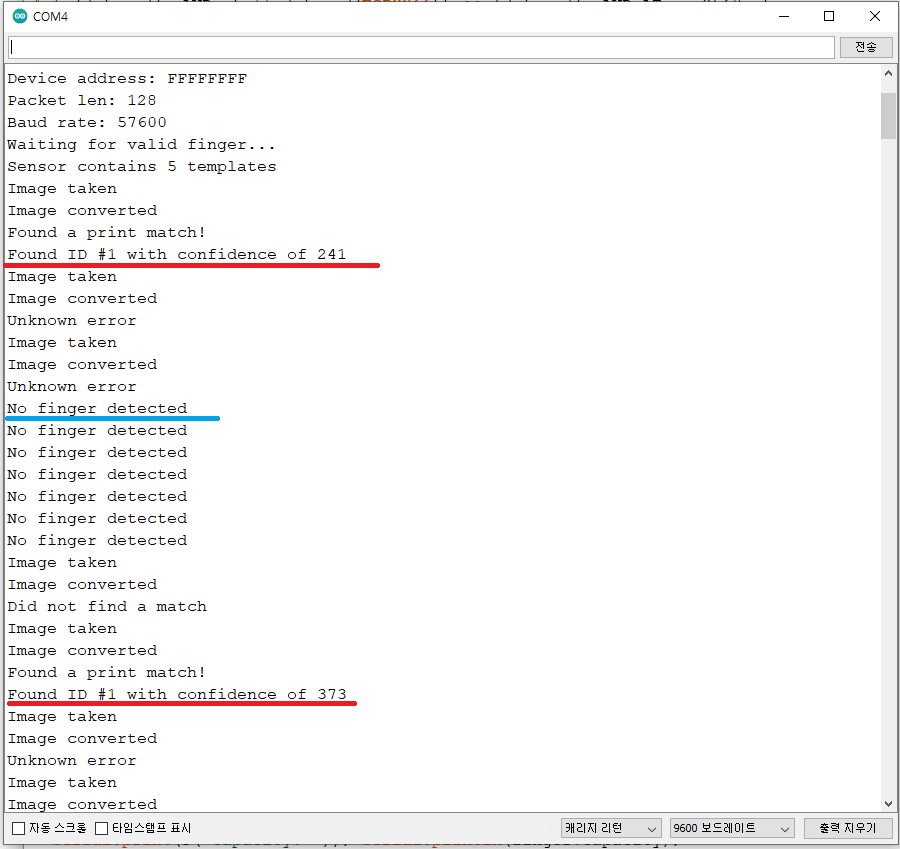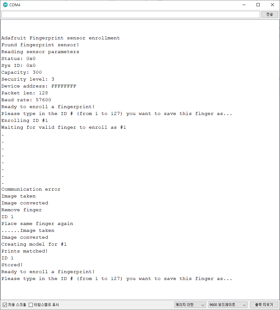 센서에 등록된 손가락을 인식시키면 매치되는 ID가 뜨면서 저장된 값이라고 알려준다.