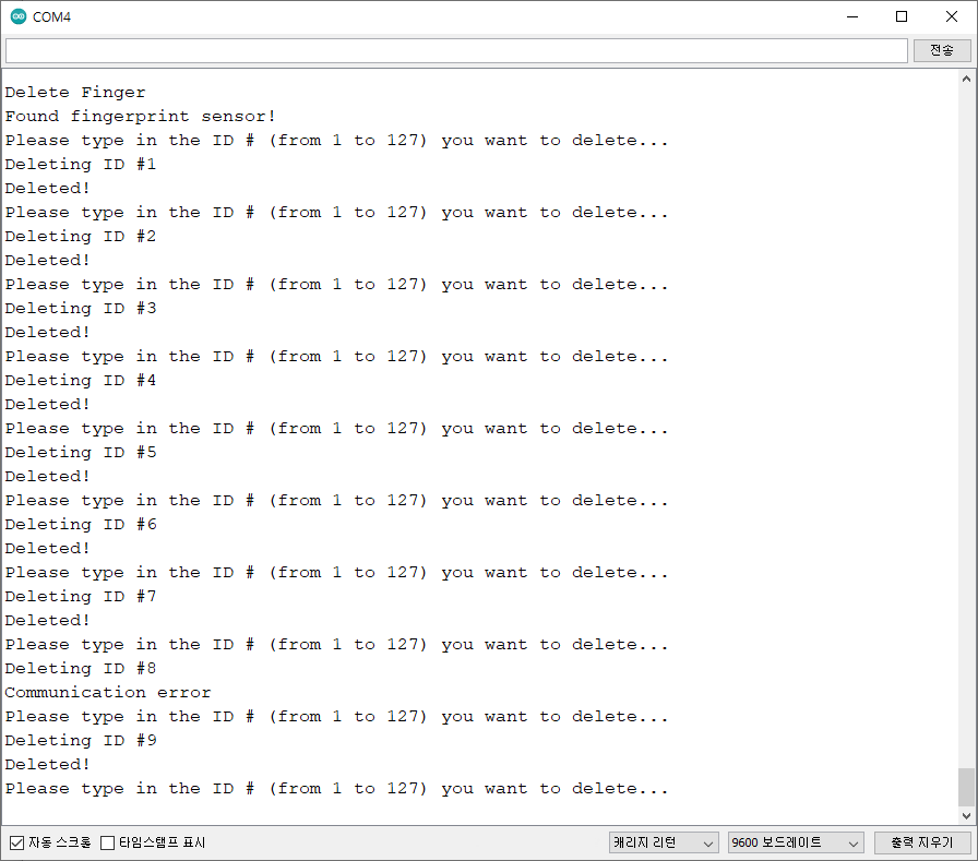 시리얼 모니터에서 지문 번호를 입력하면 해당 지문 데이터가 지워지게 된다.