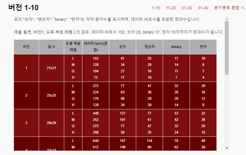 version 은 QR코드 버전으로 제일 작은 사이즈가 버전 1 입니다.