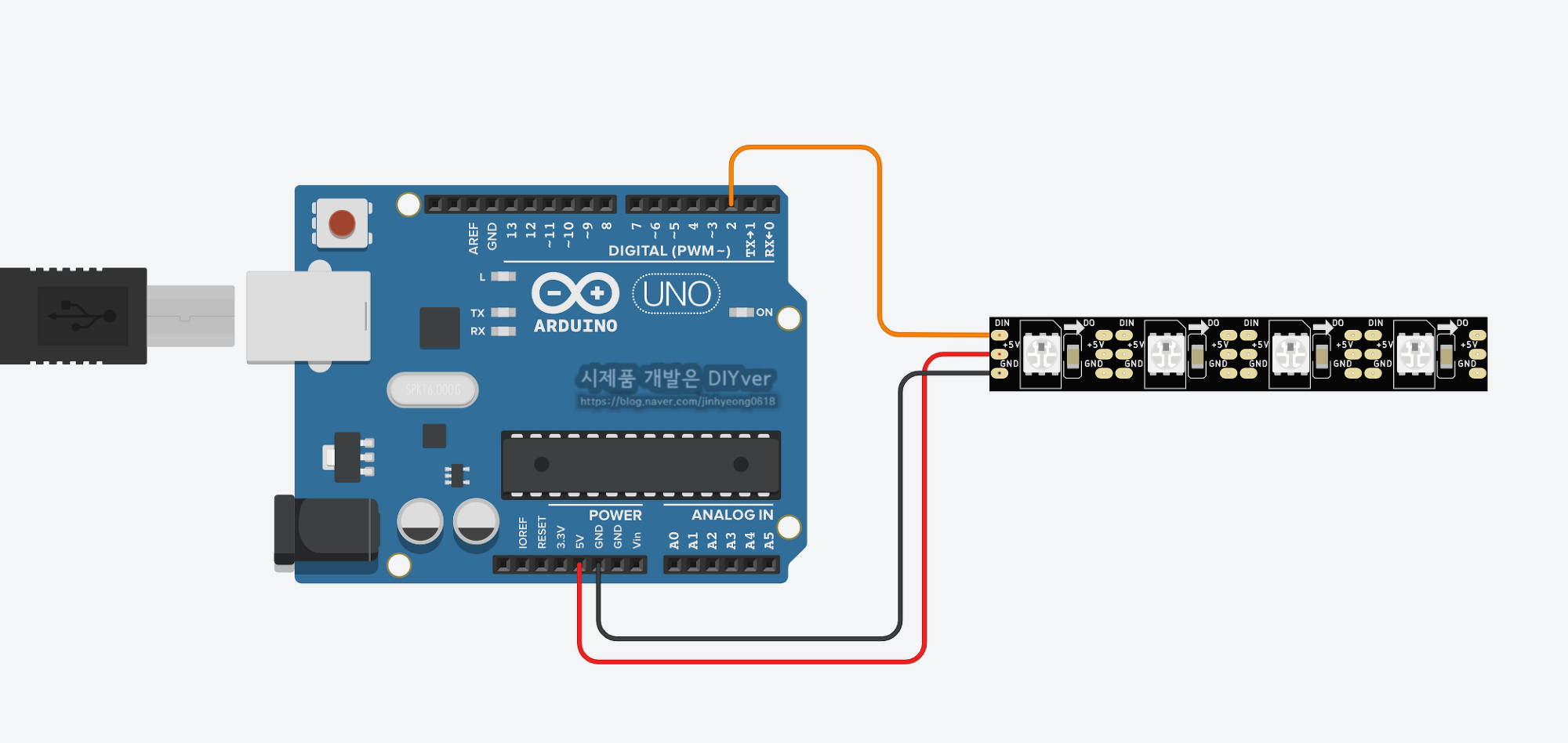 D2(디지털 핀 2번) 과 GND. 5V를 네오픽셀에 연결해주면 된다.