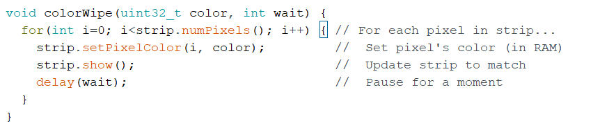 for(int i=0; i<strip.numPixels(); i++) { // For each pixel in strip...
