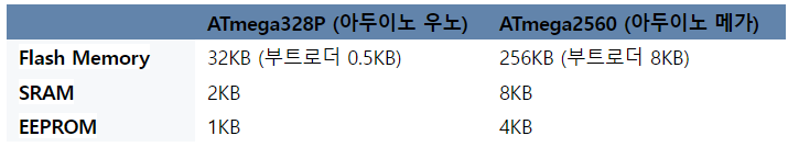 아두이노 우노와 메가에 비해서 플래시 메모리가 엄청 큰 것을 확인할 수 있다.