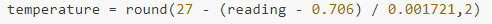 temperature = round(27 - (reading - 0.706) / 0.001721,2)