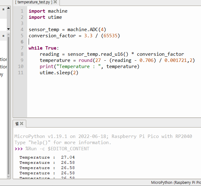 while 반복문과 utime.sleep(2) 명령을 통해 2초마다 온도를 측정해서 출력해주는 코드가 되는 것이다.