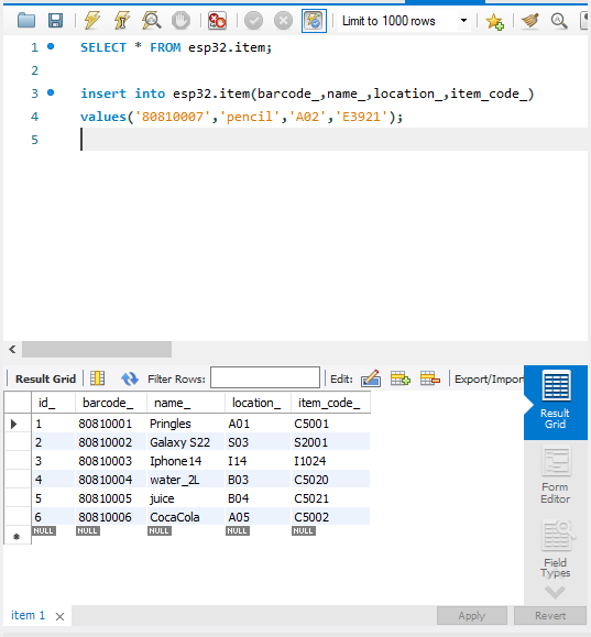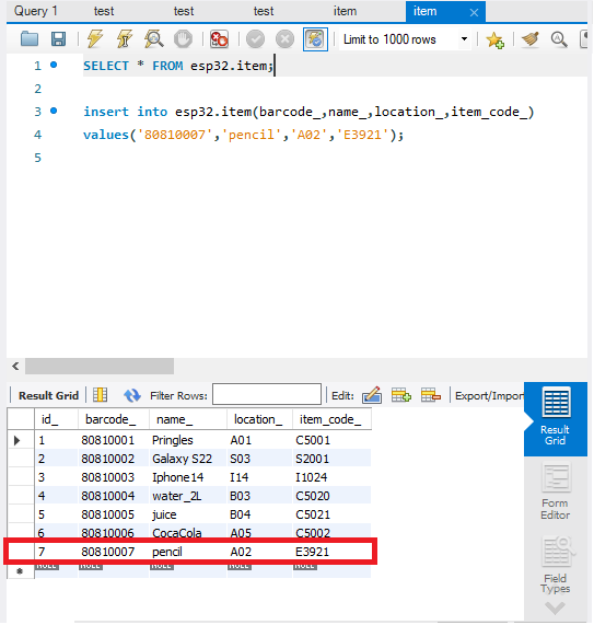 insert into esp32.item(barcode_,name_,location_,item_code_) values('80810007','pencil','A02','E3921');