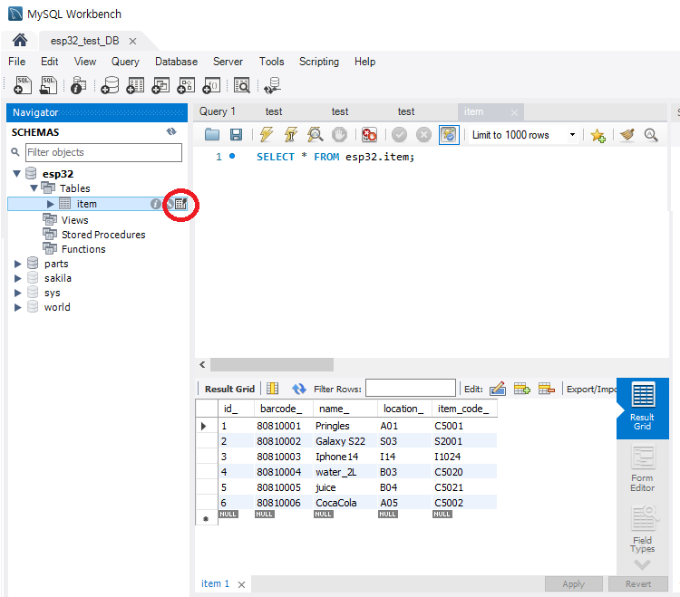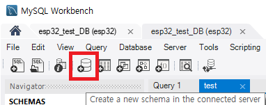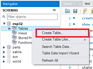 네비게이터 에서 스키마 >> 생성한 esp32 >> Tables 우클릭 을 해서