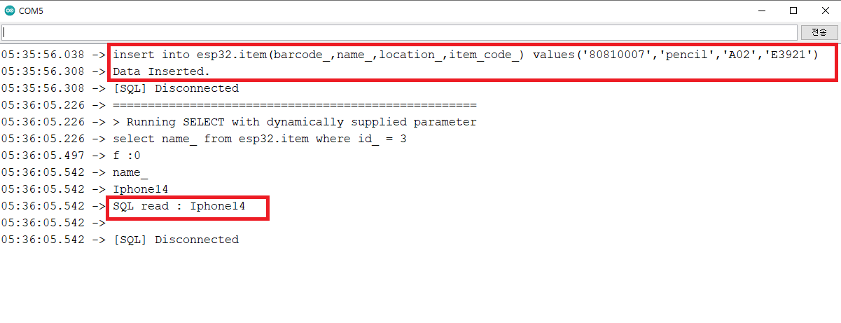 아두이노 코드에 넣어놓았던 SQL 명령으로 데이터가 하나 추가되었음을 확인할 수 있다.