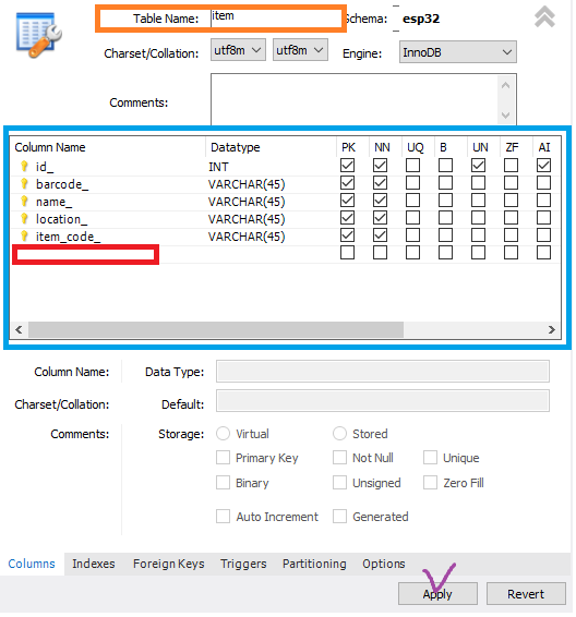 그리고 데이터타입과 PK NN UN AI 등 체크해줄 부분은 체크해준다.