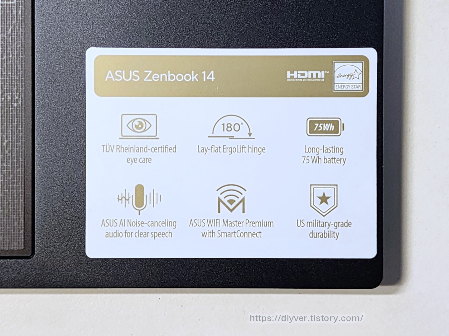 이 스티커는 ASUS가 콕 집은 젠북 14의 장점 6개를 담고 있다고 봐야겠다.