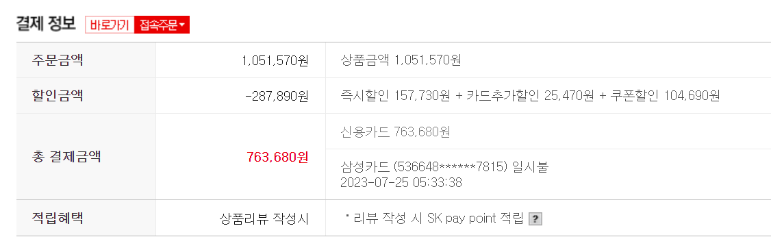 할인받아서 최종 구매가격은 763,680 원에 구매했다.