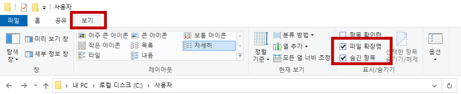 파일확장명이랑 숨긴항목이 표시되게 바꿔준다.