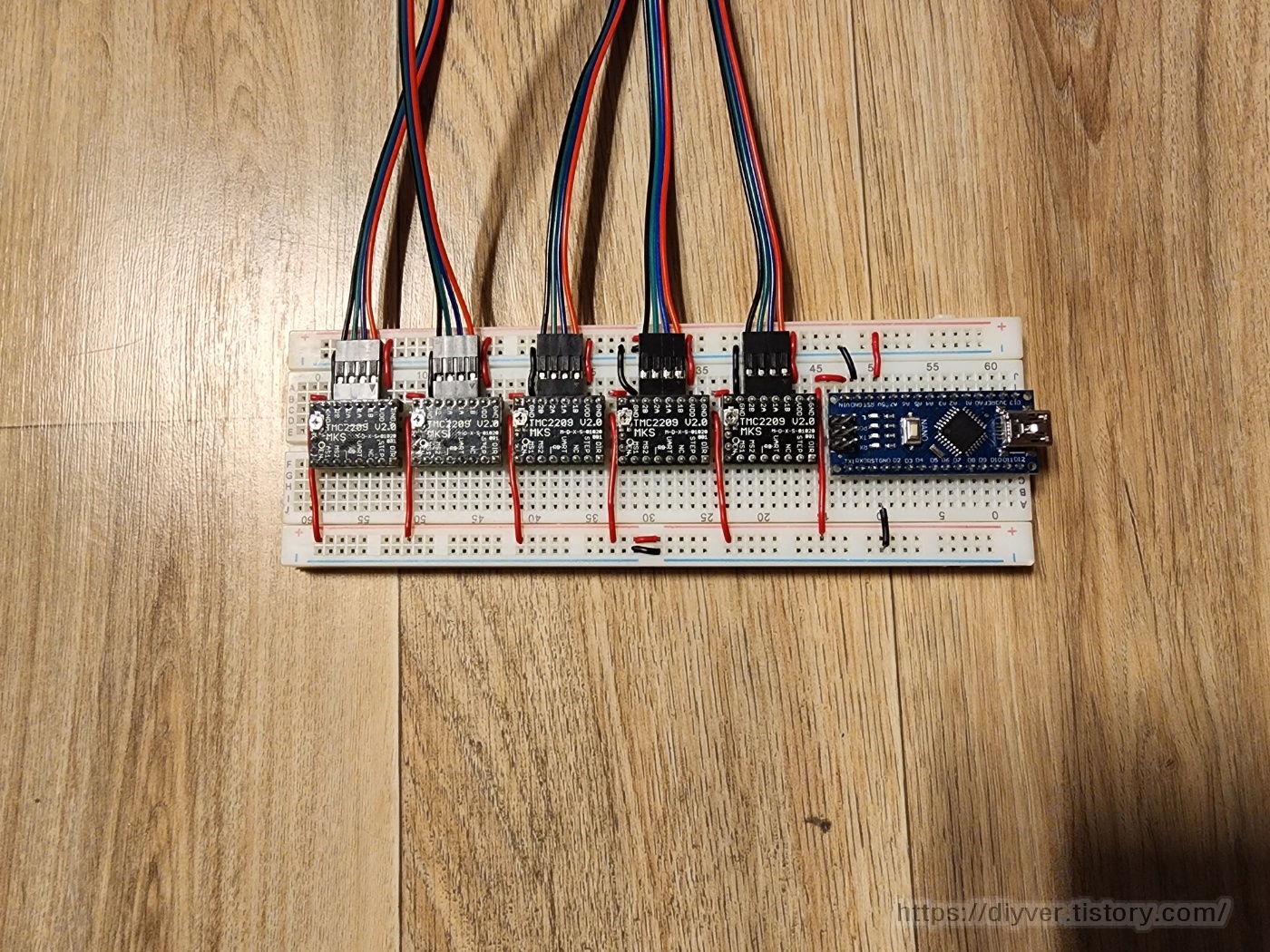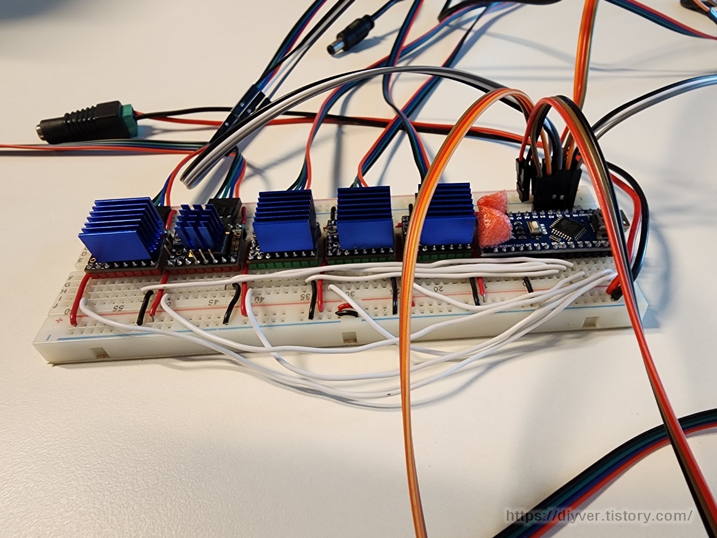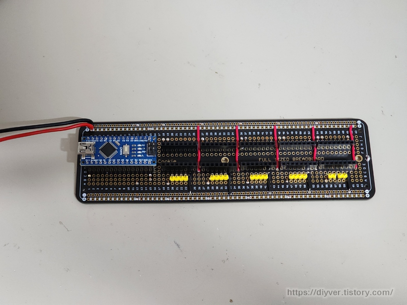 이렇게 테스트 보드(브레드보드)를 이용하여 구동을 테스트한다.