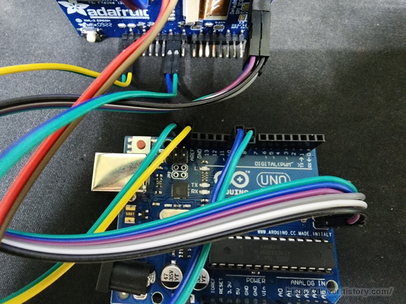 일단 아두이노 우노에 터치스크린 쉴드를 그냥 붙이면 네오픽셀을 사용할 수 없기 때문에
