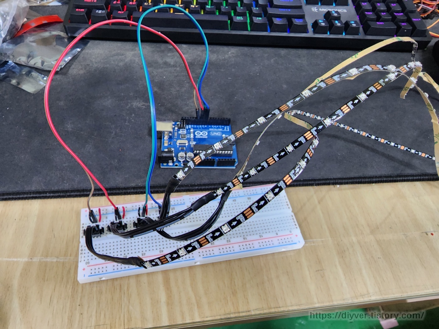 네오픽셀 스트립을 하나로 묶어서 사용한다면 디지털 핀을 1개로도 사용 가능하다.