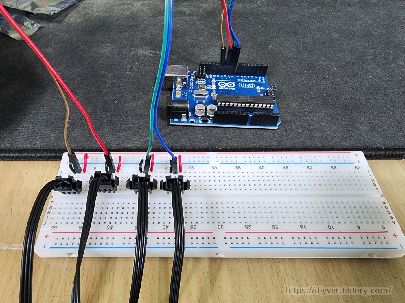 네오픽셀 스트립을 4줄을 사용했다. 즉 디지털 핀이 4개 필요하다는 뜻