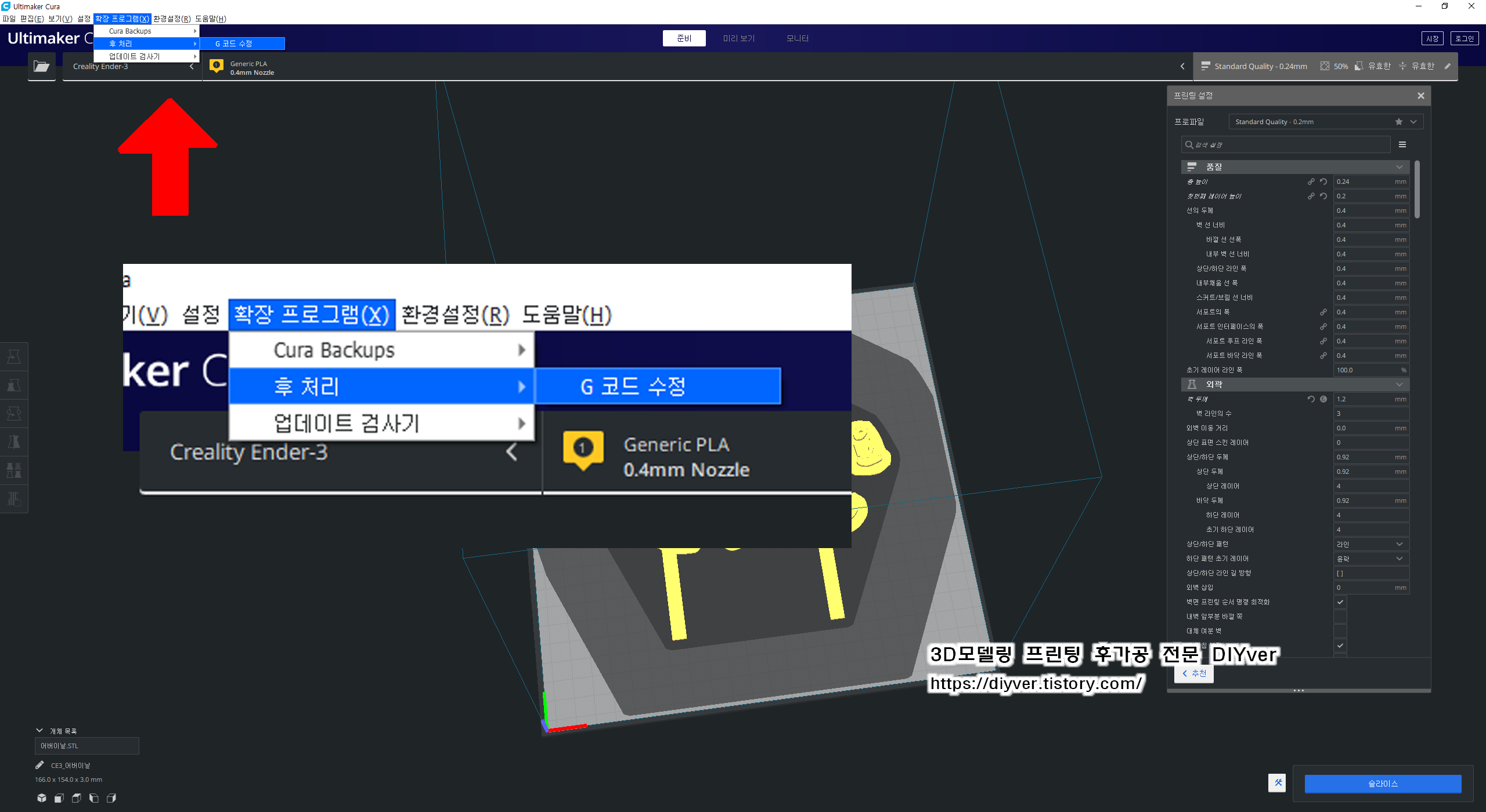 이제 이것을 CURA 같은 3D프린터 슬라이서 프로그램으로 출력 준비를 해준다.