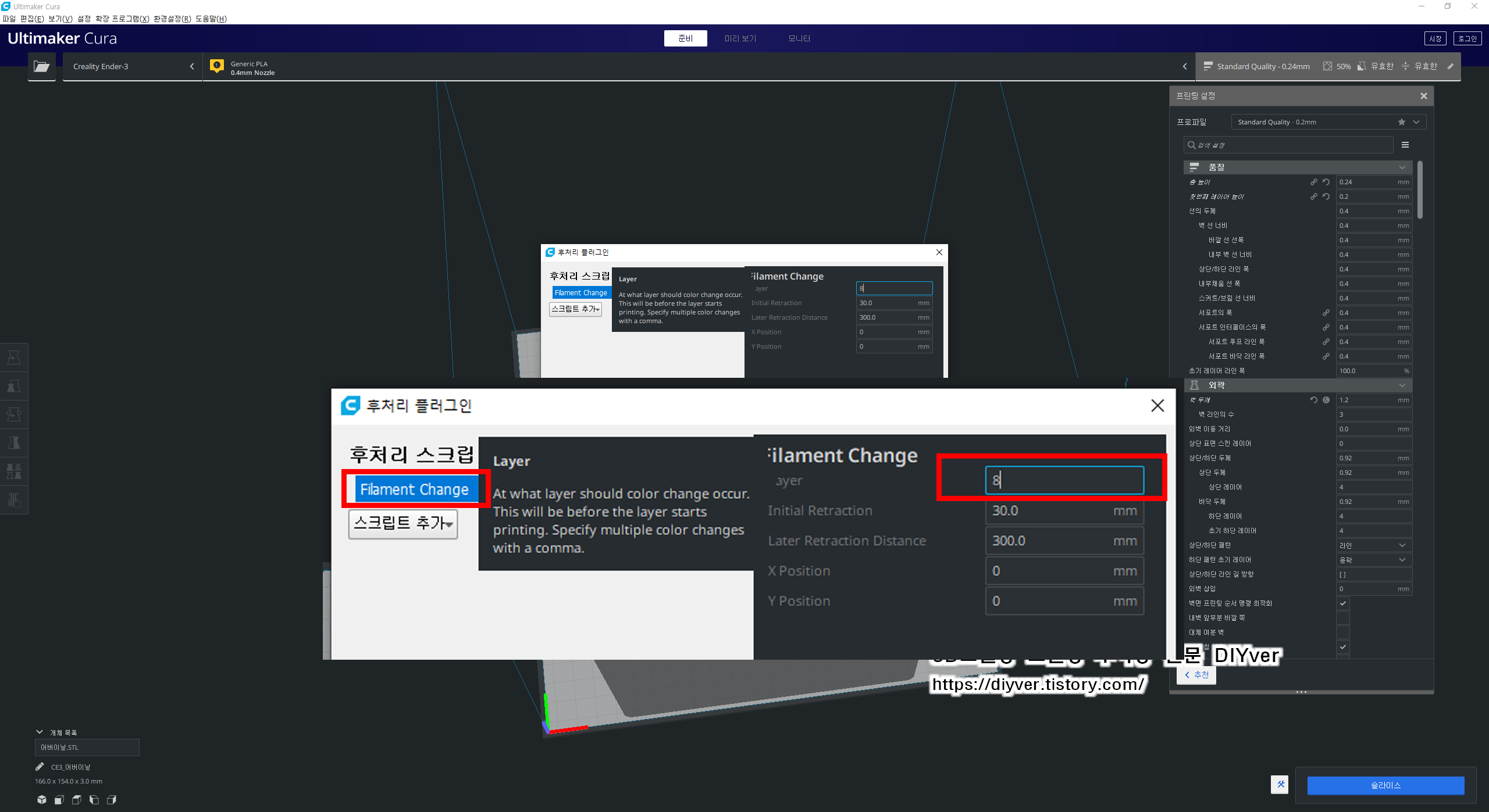 필라멘트를 바꿔줄 레이어 층 수를 입력해 주면 된다.