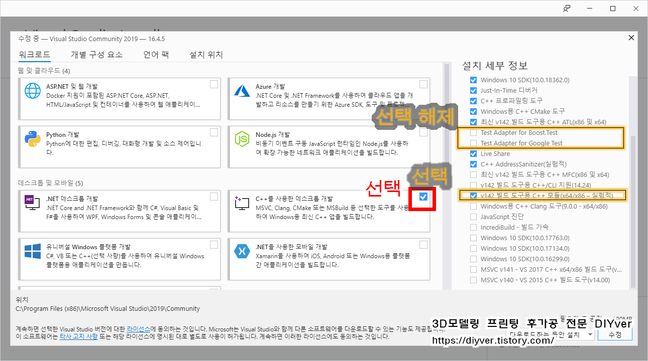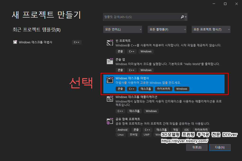 우선 c++을 사용한 데스크톱 개발을 선택한다.