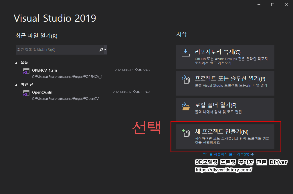 설치가 정상적으로 되고, 재부팅한다음에 visual studio 2019를 실행한 모습이다.
