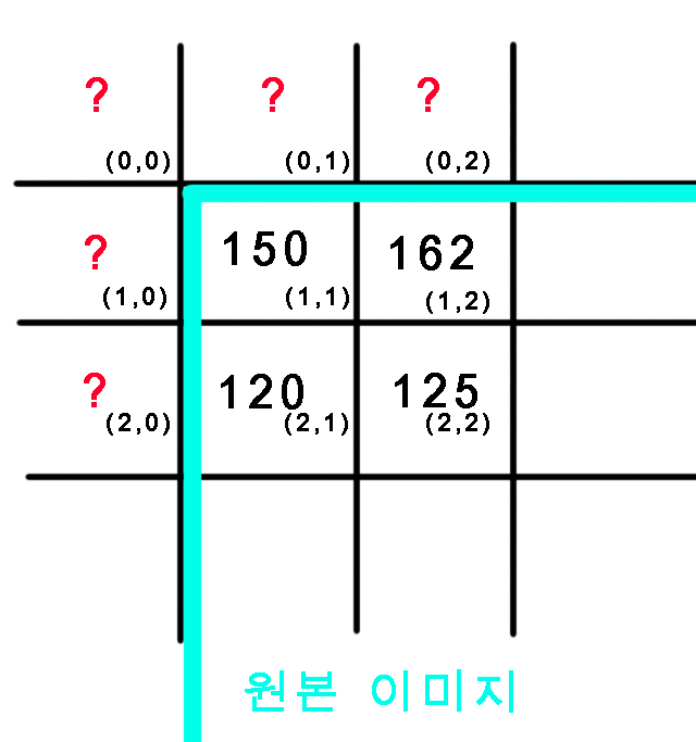 (0,0), (0,1), (0,2), (1,0), (2,0) 의 값은 뭐라고 계산이 되는거지?