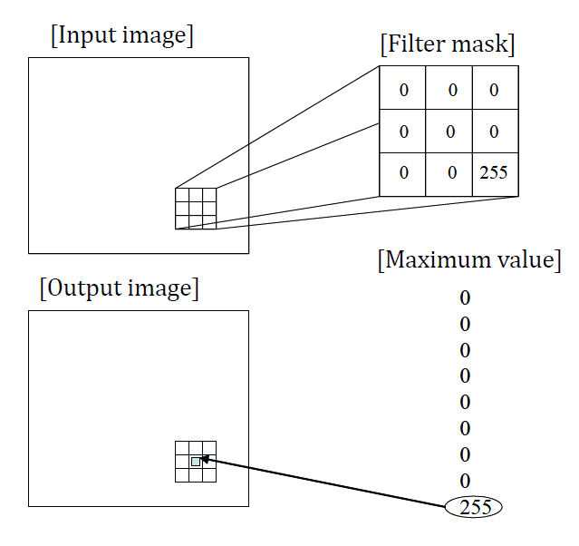 필터내에 가장 큰 값을 필터 중심 픽셀 값에 적용시키는 것이 원리이다.