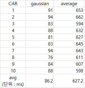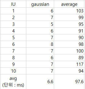 가우시안 필터가 평균 필터보다 약 7배 정도 빠른 것을 알 수 있다.