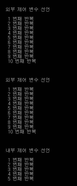 제어 변수를 밖에서 선언만하고, for 문에서 초기화를 하고 반복문을 실행한 결과이다.