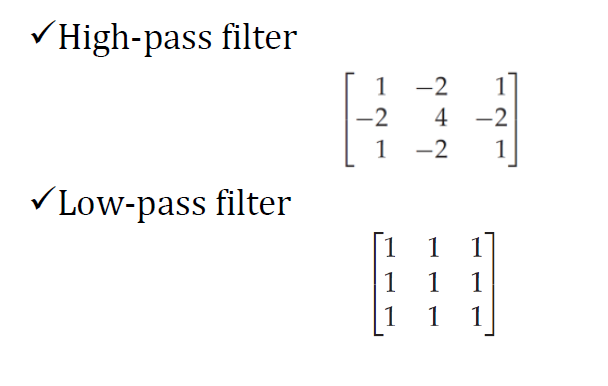 High pass filter 는 필터 영역 중앙에 가중치를 더 많이 주는 것을 볼 수 있다.